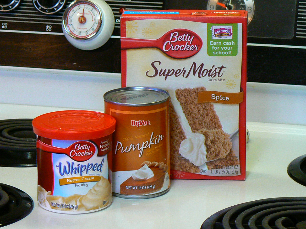 You start with these four things, spice cake mix, canned pumpkin, some sort of delicious icing, and a stove...OK, OK, you also need a bowl, mixing spoon, and cookie sheet...but seriously...THAT'S ALL!!!!